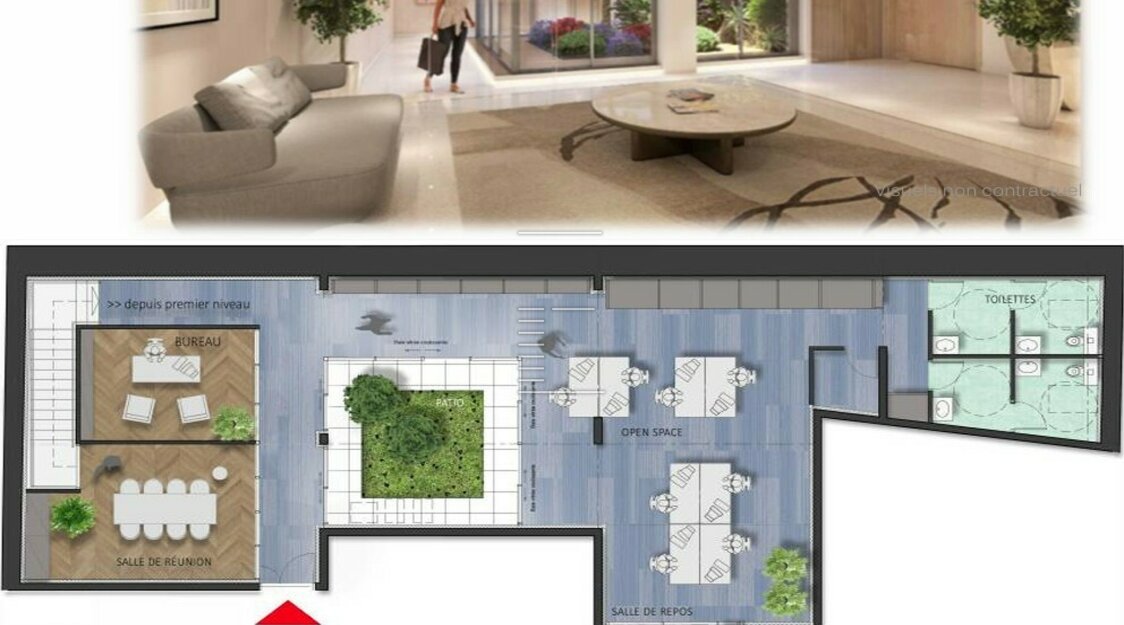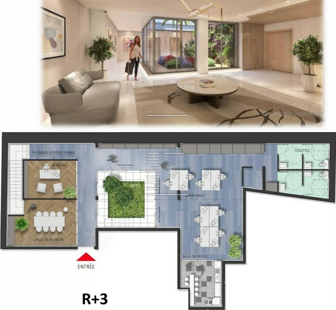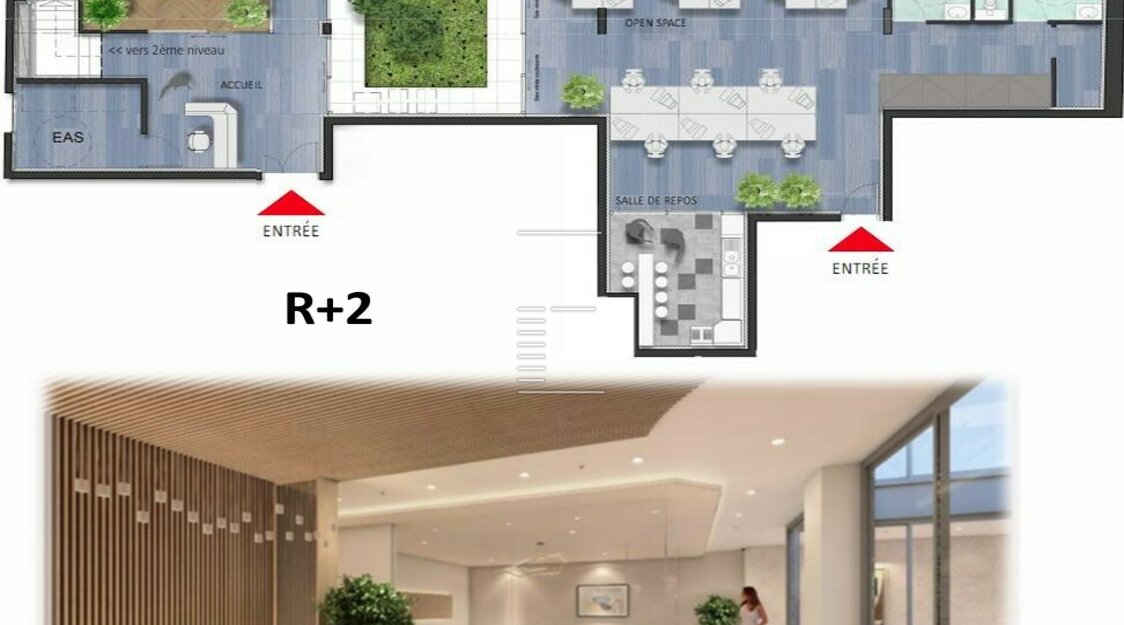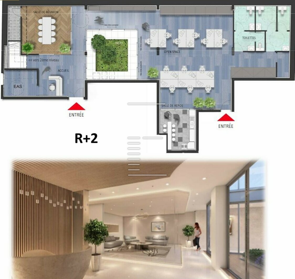 A central patio of 24.40 m² structures the whole and brings appreciable natural light, promoting a qualitative and soothing working environment.