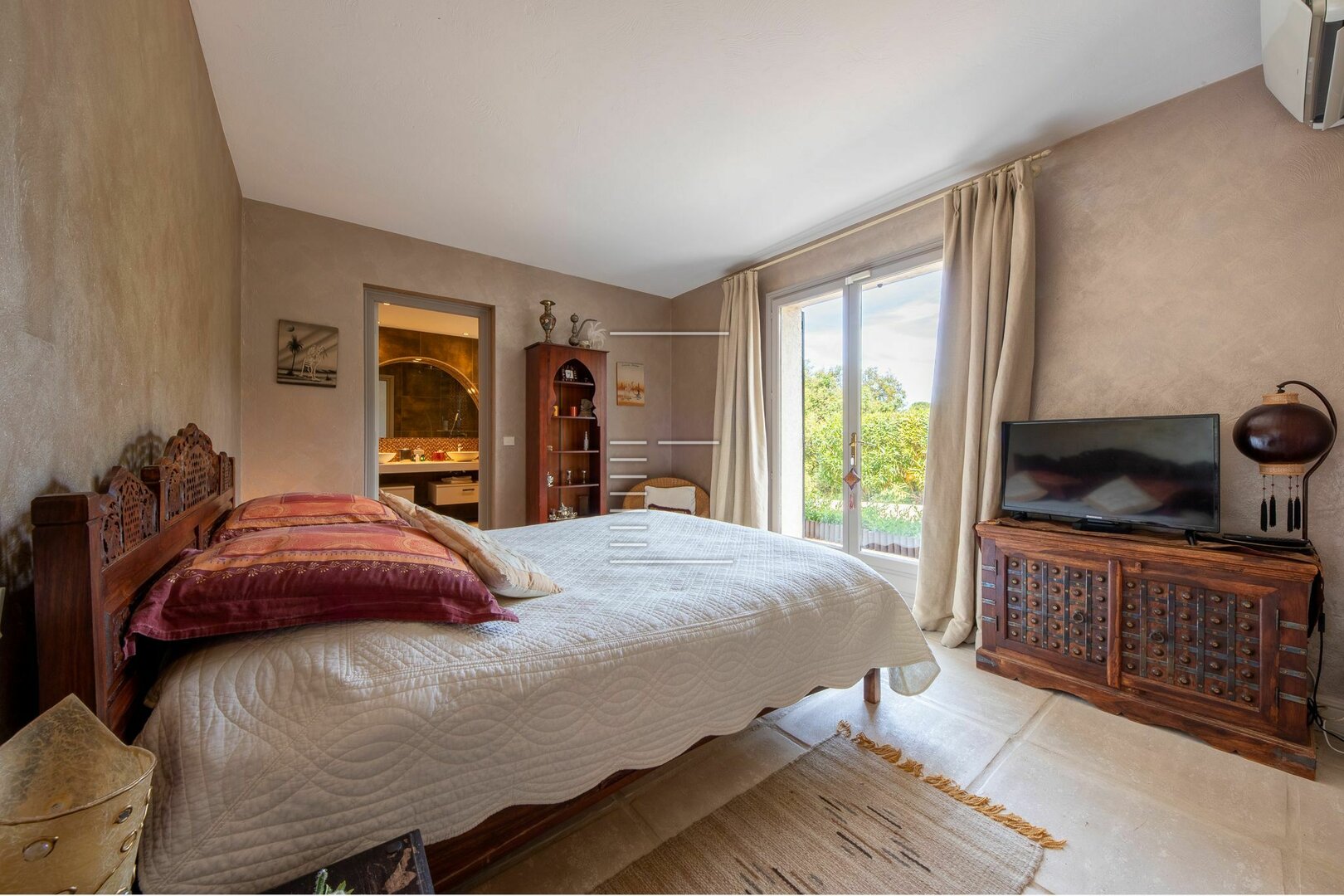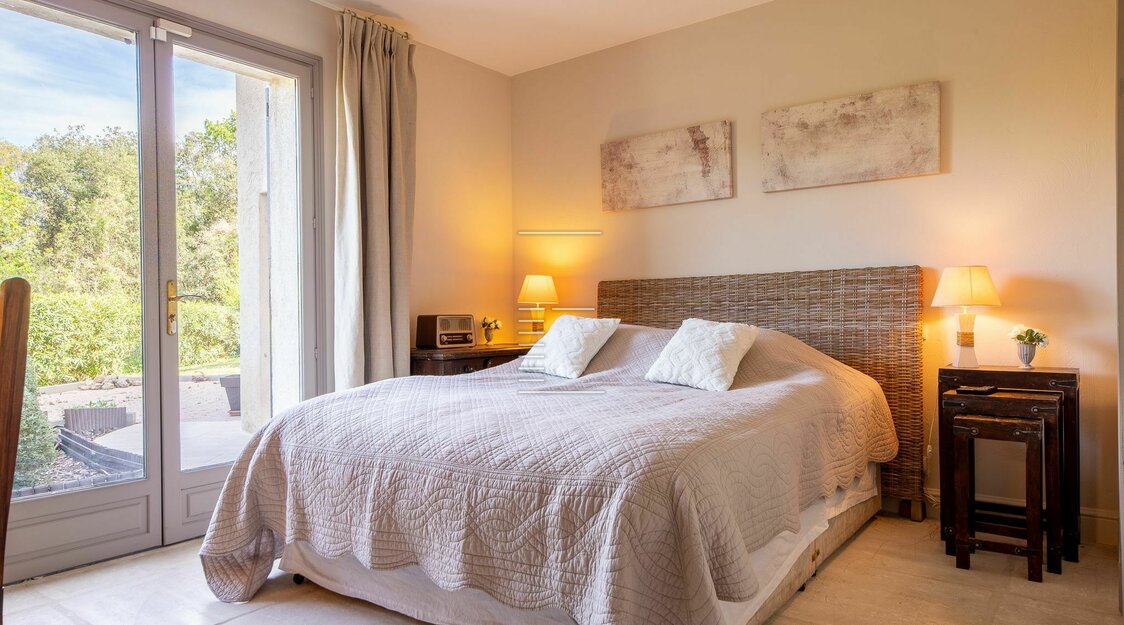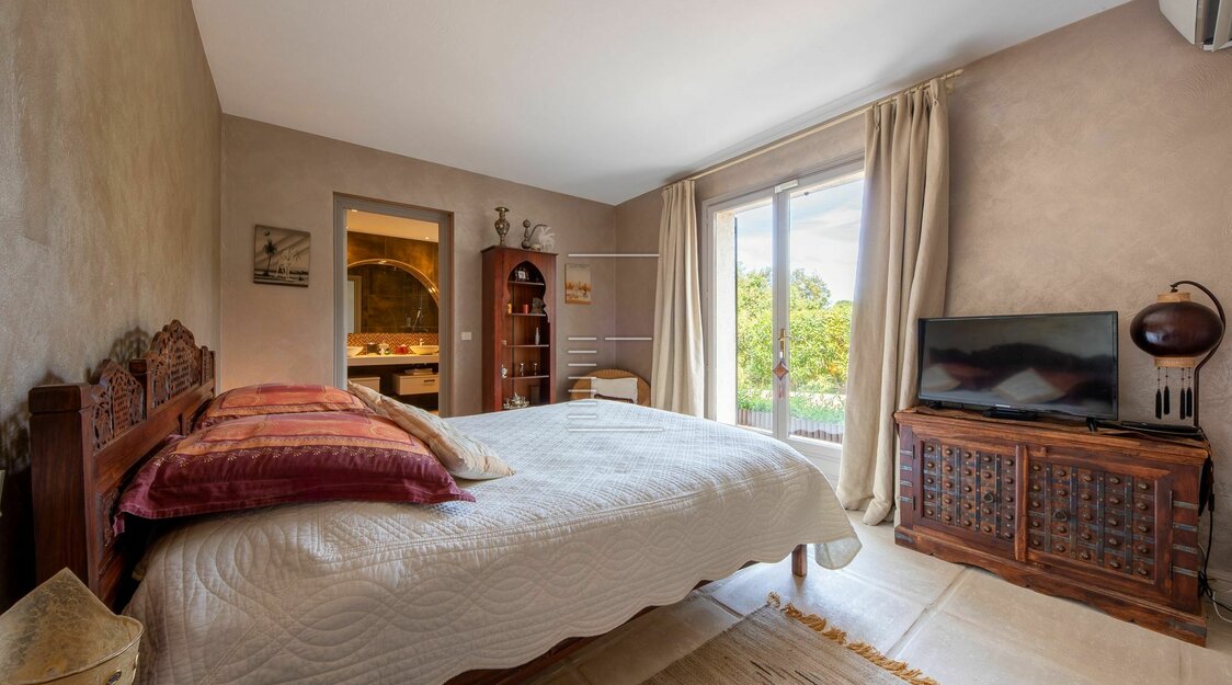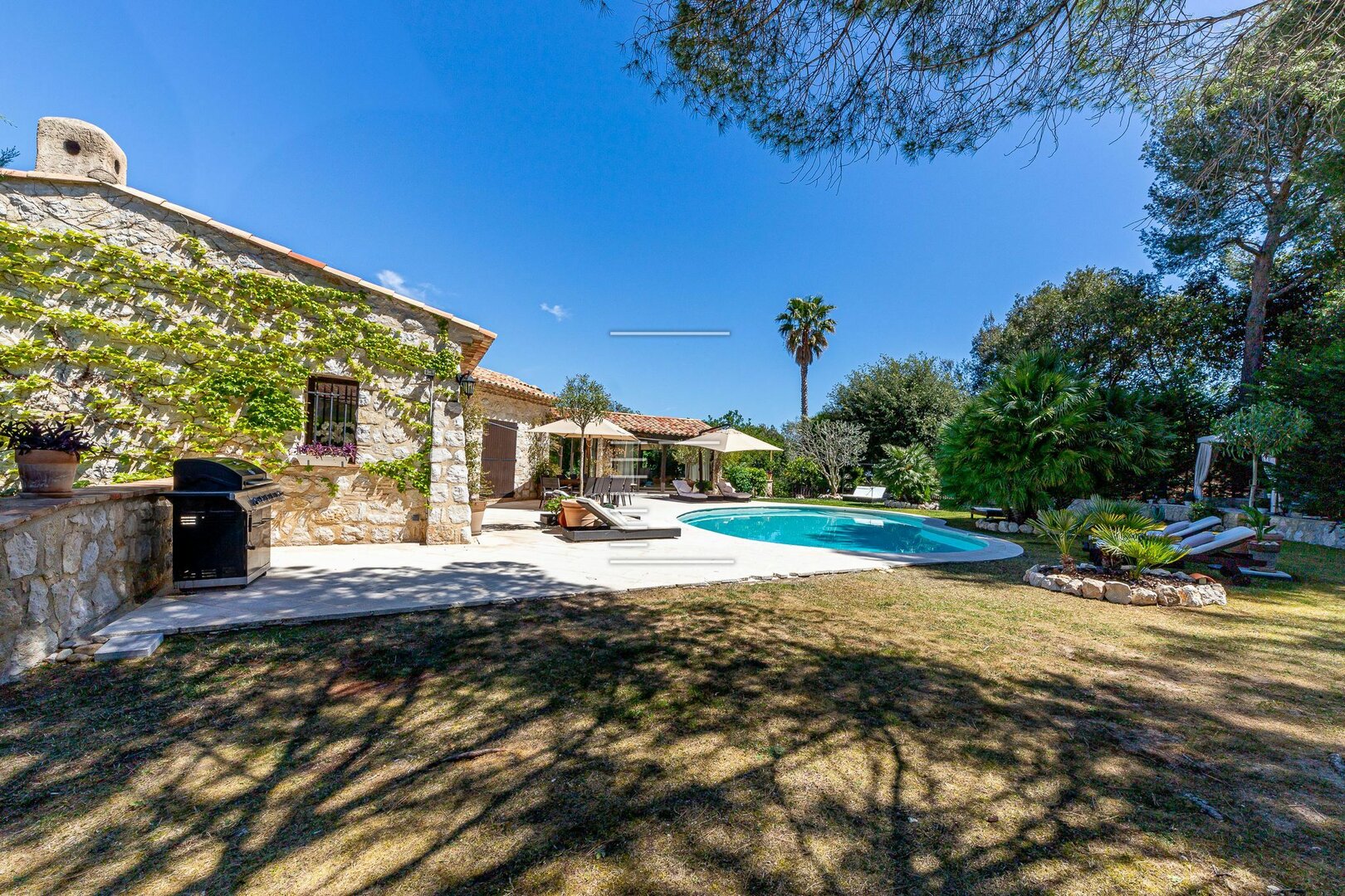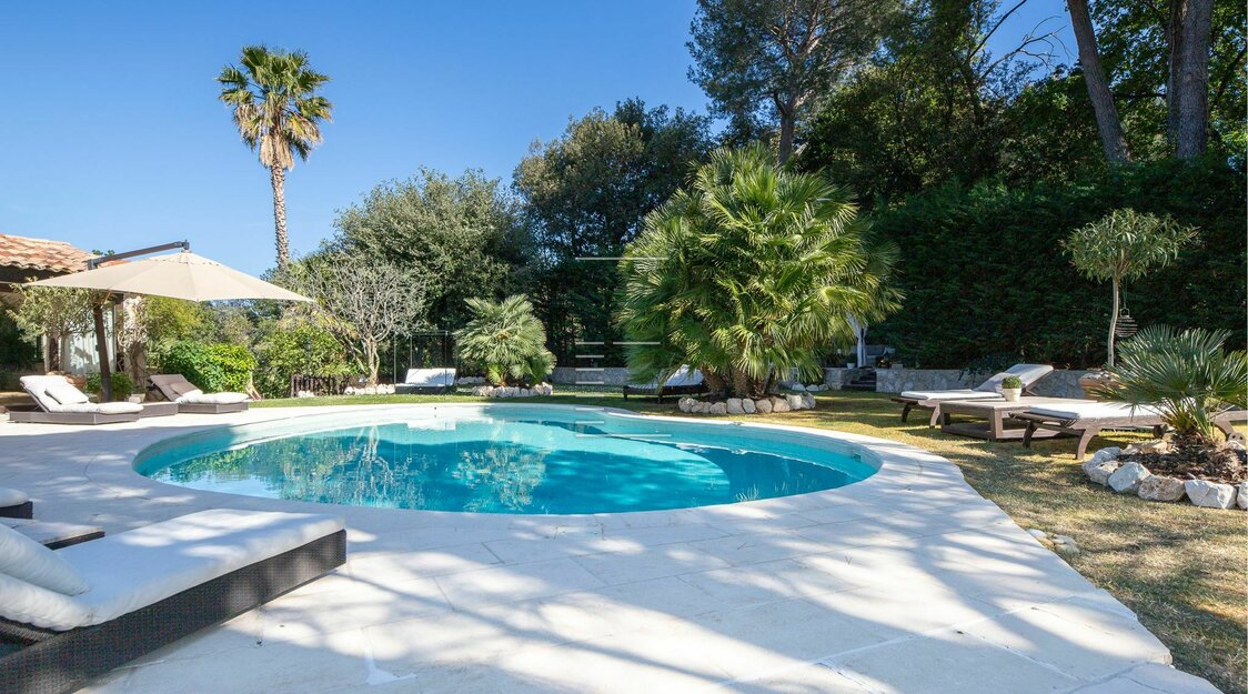 À l’extérieur, une piscine chauffée de forme haricot (7x4 m) s’ouvre plein sud, bordée d’un jardin méditerranéen, de terrasses ensoleillées et d’un espace pergola.