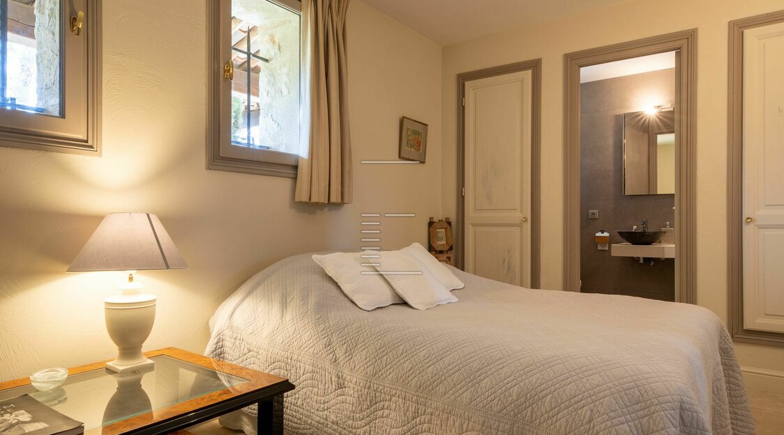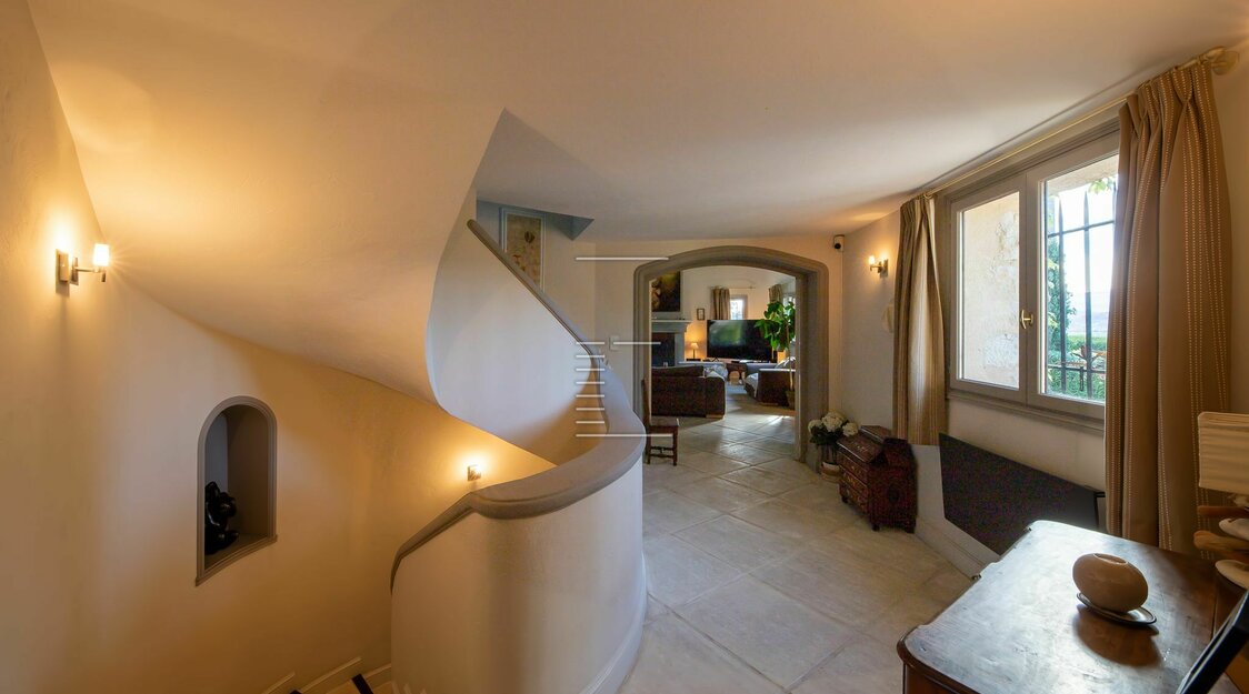 Surplombant un terrain de 4 104 m² – composé de 2 260 m² plats et 1 844 m² boisés en restanque – cette demeure d’exception de 490 m² (dont un appartement indépendant de 40 m²) offre une vue panoramique sur le village, le jardin et la forêt environnante.